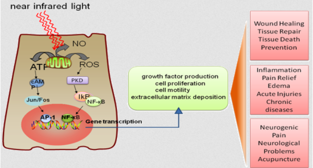-Enhanced cell proliferation and differentiation. Laser-induced increases in NO, ATP and other compounds that stimulate higher activity in cell proliferation and differentiation into mature cells.